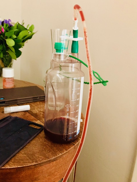 Gelukkig ging het de tweede week een stuk beter, mn mentaal. Ik schuifelde meer rond, ging af en toe naar buiten en kon meer in huis doen. Ik heb 2 volle weken met een drain gelopen. Dat was minder. Er was veel wondvocht, waarschijnlijk ook door het gebrek aan lymfeklieren in m’n oksel. Me and my drain!!! Onafscheidelijk waren we. Je vergeet hem één keer en dan noooooit meer, want je wilt niet vaker dan één keer met de draad blijven haken, brrrr.