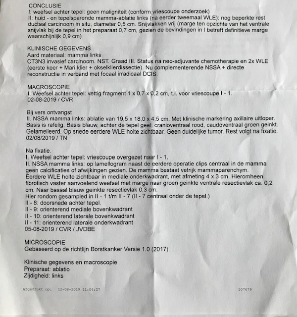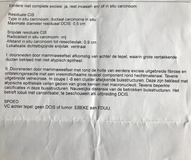 Een week na de operatie was de uitslag van de patholoog bekend. In feite maakte het voor het verdere traject niet uit. Al was het wel fijn als er in ieder geval iets van die DCIS gevonden werd. Liever geen tumorcellen AUB! DCIS cellen zijn nog gevonden, tumorcellen niet. Tijdens de operatie is op de OK door de patholoog de huid achter de tepel getest (vriescoupe test), om ter plekke te kunnen beslissen of de tepel behouden mag blijven. Dat wordt dan achteraf voor de zekerheid nog een keer uitgebreid onderzocht. Abacadabra zo’n pathologisch verslag.
